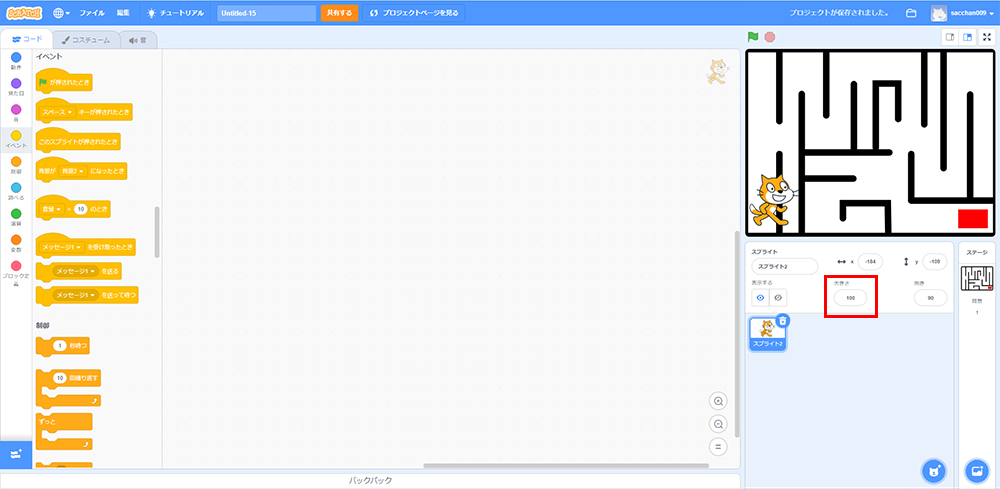 ネコの大きさを小さくしてスタート地点に置こう。一番左がいいかな。
