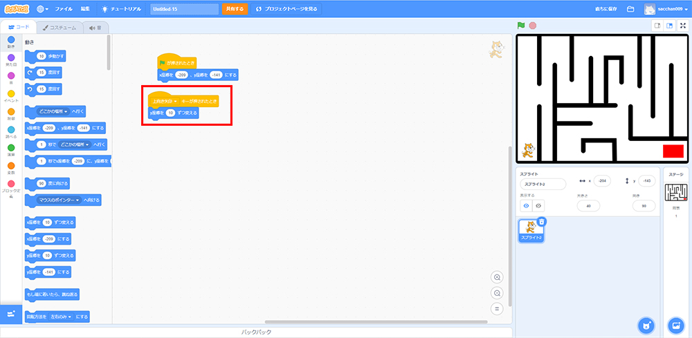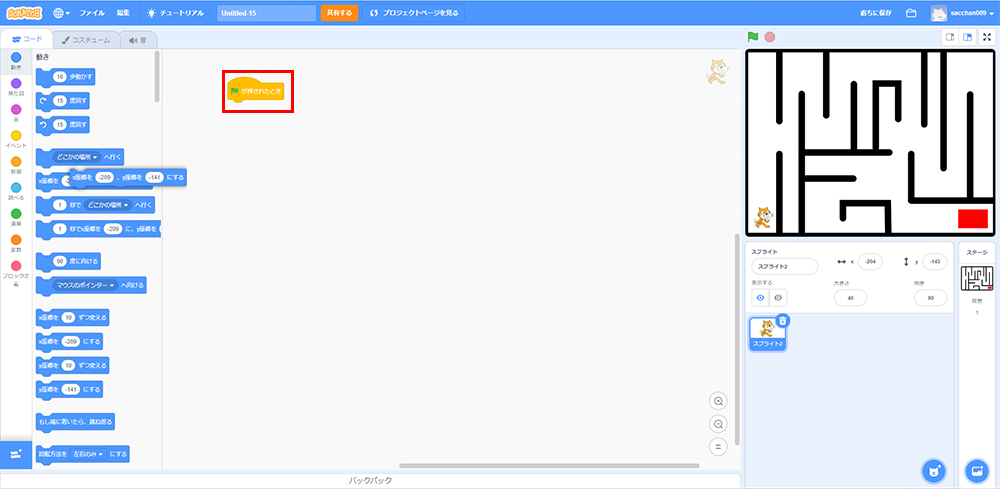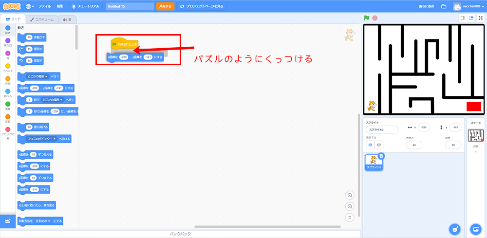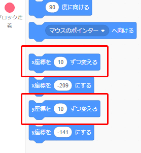ブロックパレットから「X座標を〇、Y座標を〇にする」をクリック。
