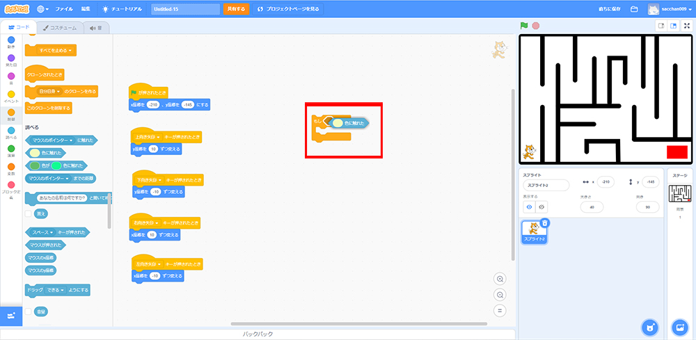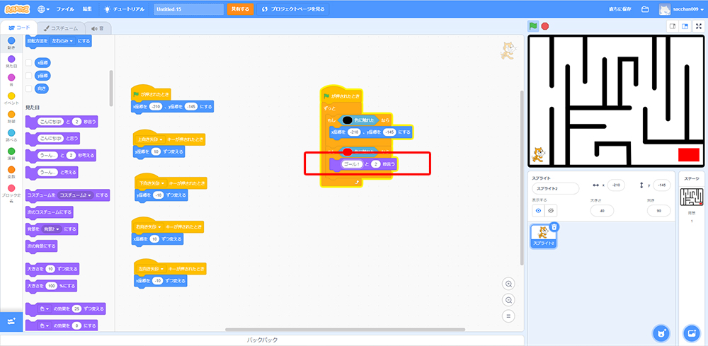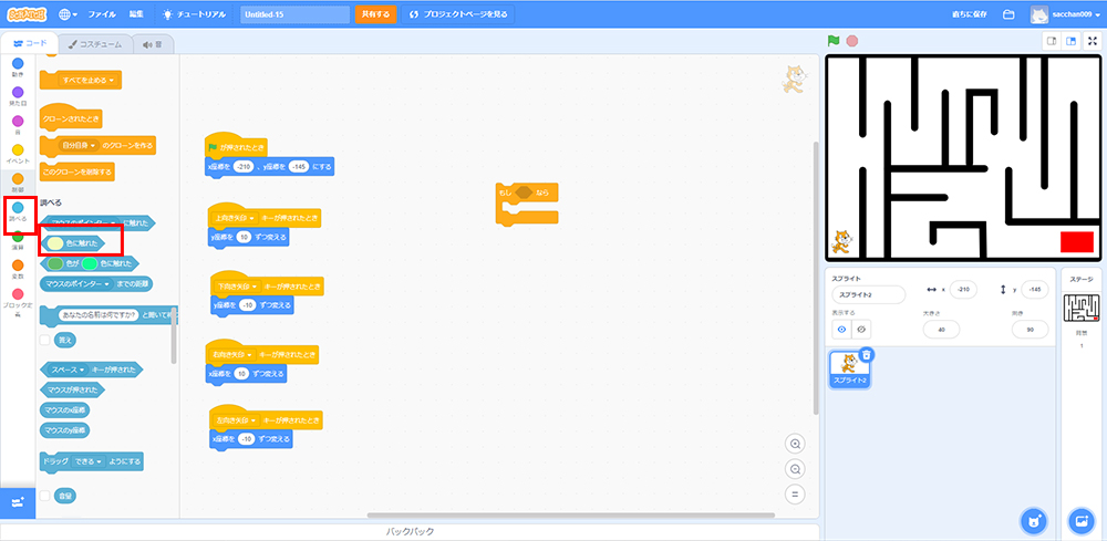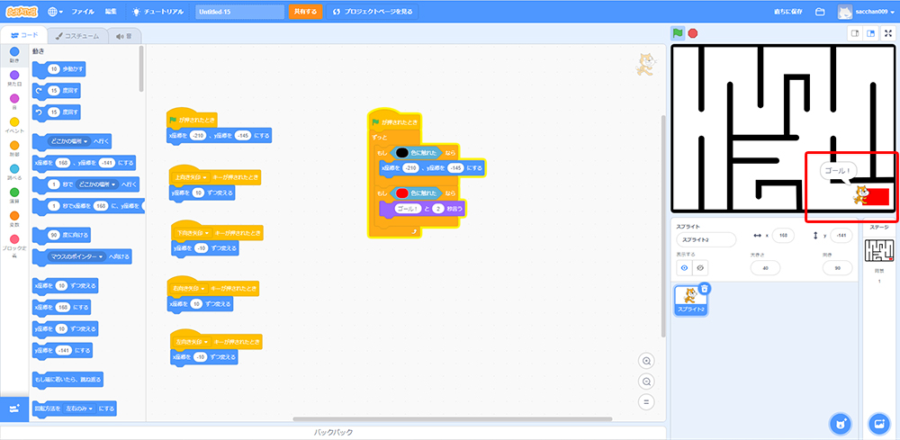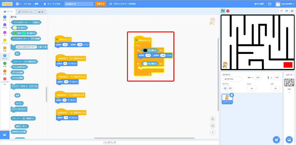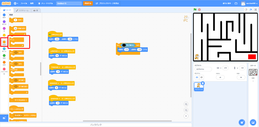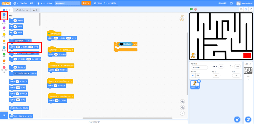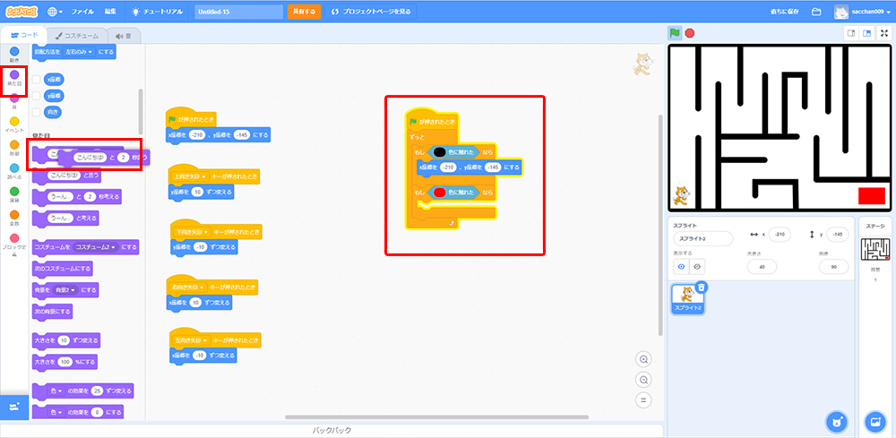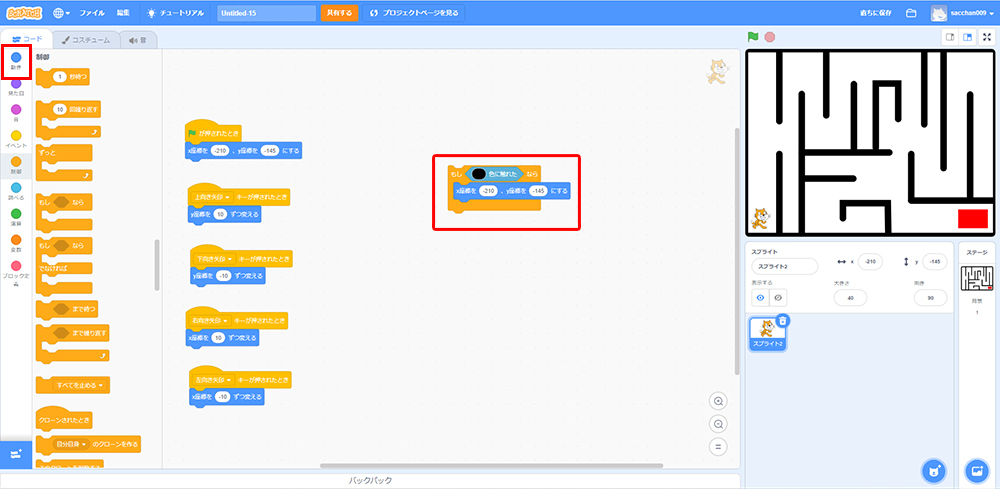 これで「もしねこが黒色に触れたら、X座標・Y座標の場所に戻る」というプログラミングができたよ!