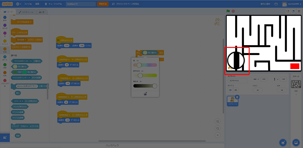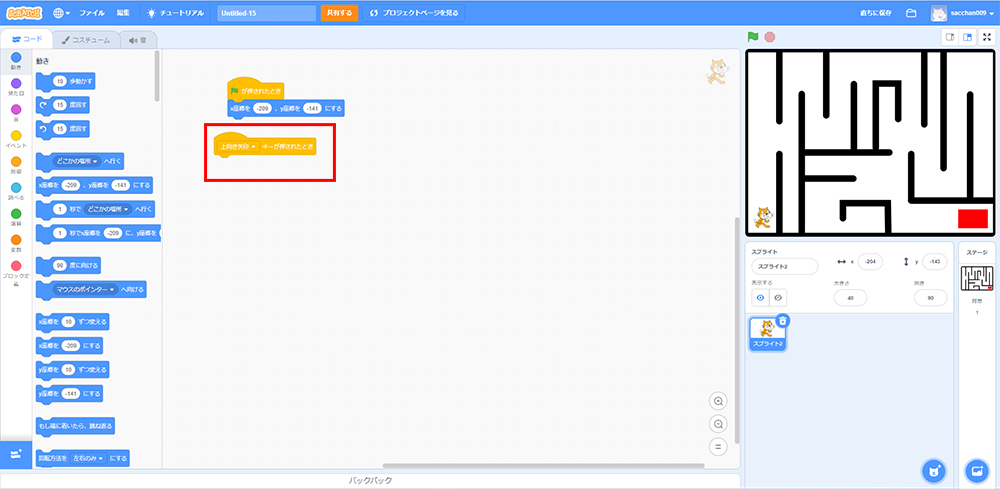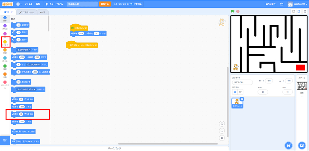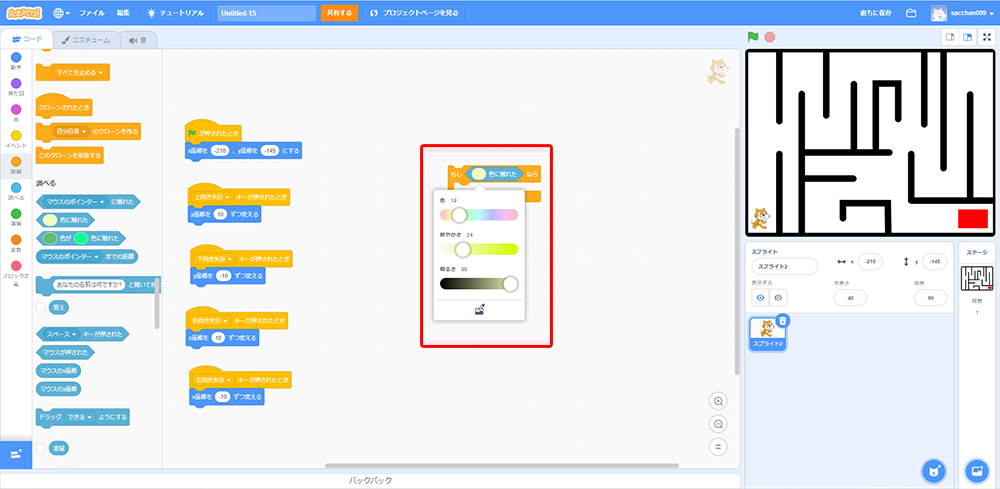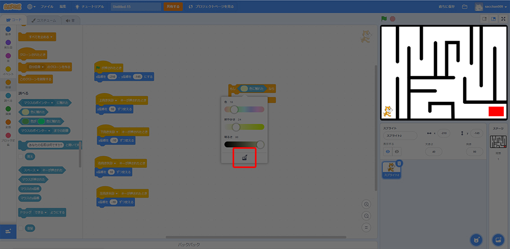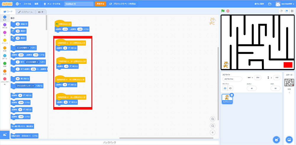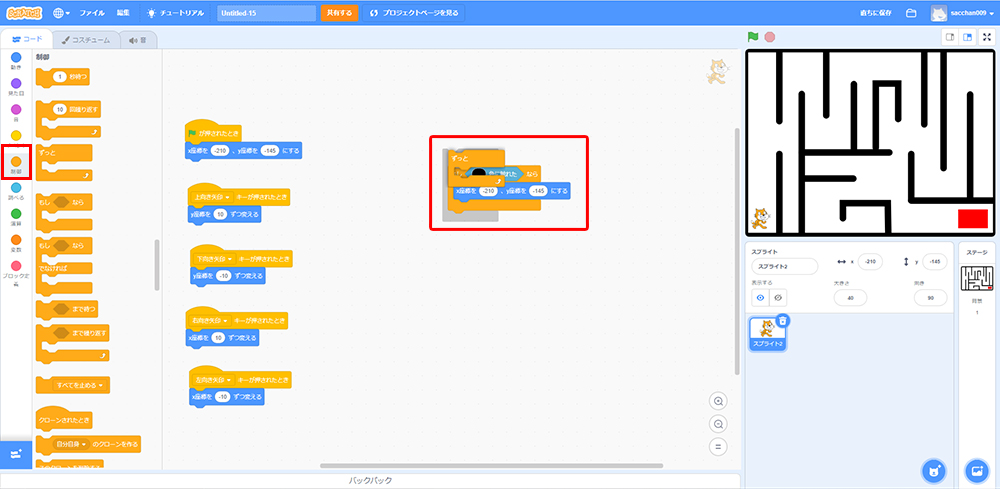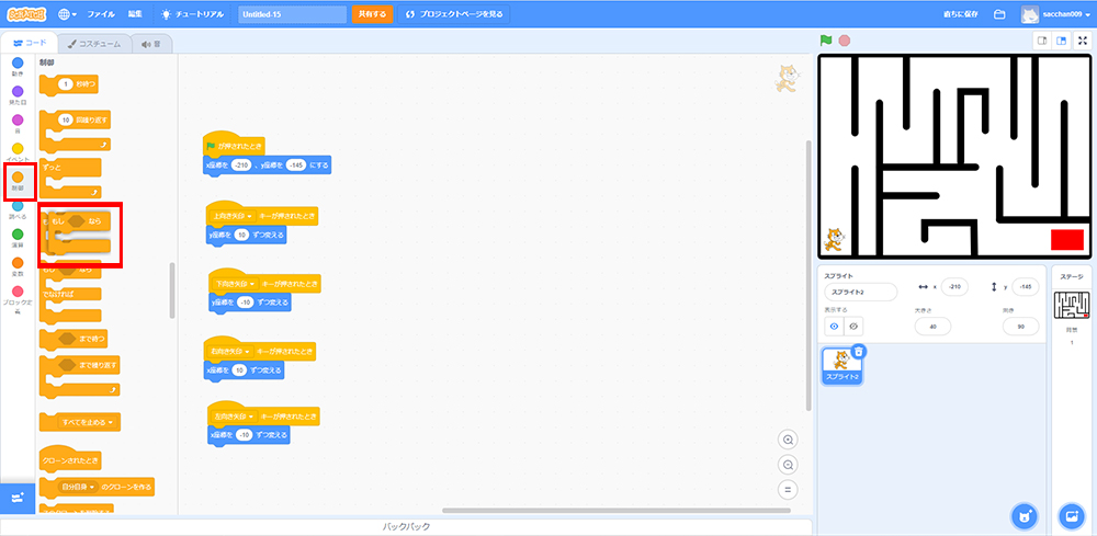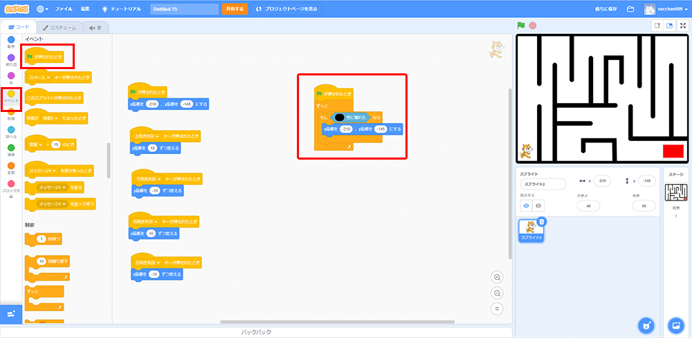 これで「もしねこが黒色に触れたら、X座標・Y座標の場所に戻る」というプログラミングができたよ!