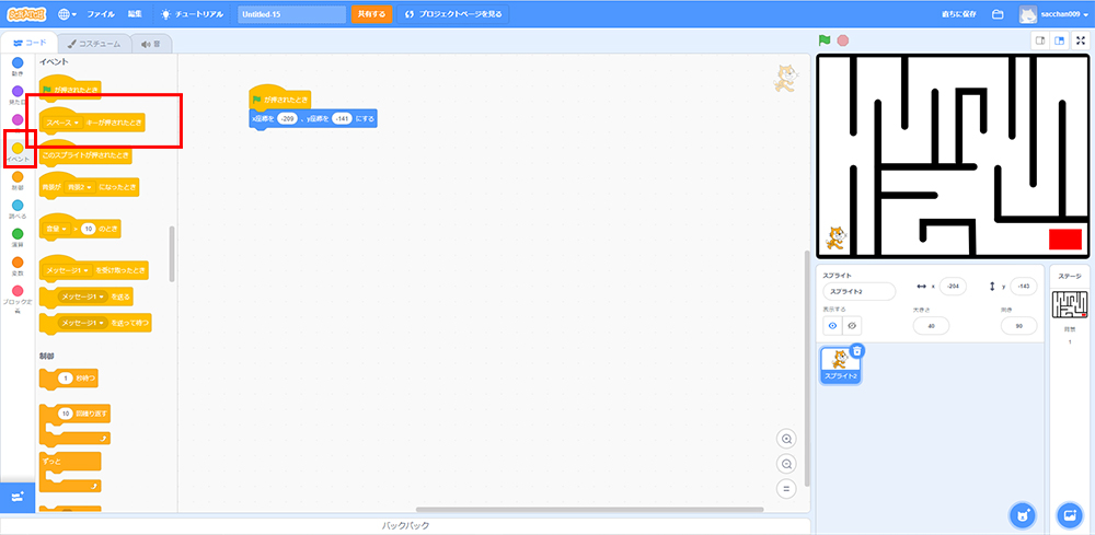 [イベント]をクリックしてブロックパレットから「【スペース】キーが押されたとき」を
